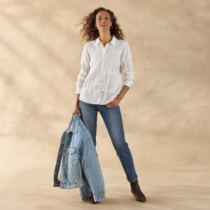 Lace and eyelet patchwork details create a melody of beauty on our oh so feminine relaxed fit top with ruching at the front yoke. collar with henley placket and shirttail hem. Cotton/Other Fiber. Hand wash. Imported. Exclusive. Sizes XS (0–2). S (4–6). M (8–10). L (12–14). XL (16–18). XXL (20–22). Approx. 26.5l.