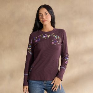 A Sundance classic body in new floral embroidery. our comfortable crewneck thermal boasts wide cuffs accented with velvet trim detail and metal buttons. Cotton/spandex. Machine wash. Imported. Exclusive. Sizes XS (0–2). S (4–6). M (8–10). L (12–14). XL (16–18). XXL (20–22). Approx. 25.5l.